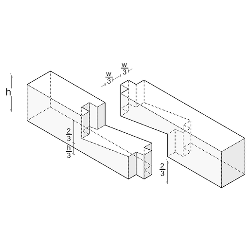 The characteristic geometry consists of two lap surfaces joined at an angle, cutting approximately one-third to half of the member thickness. Mortises are drilled into the overlapping areas, into which wooden pegs are inserted as locks. These pegs penetrate both members and secure the connection against longitudinal displacement. The beveled shoulder supports load transfer and reduces cross-sectional weakening compared to pure tenon joints.