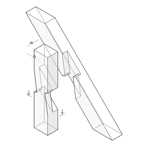 The mechanical function relies on the combination of lap joint and end offset. The oblique geometry enables transfer of diagonal forces, while the end offset provides additional shear and compression surfaces. The connection transfers shear forces effectively under oblique loading directions.