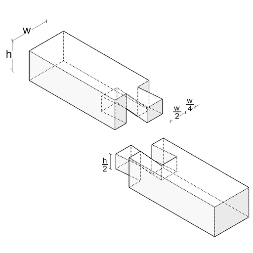 The connection can be executed in various proportions, with the size of the dovetails adapted to the lap length and expected loading.
