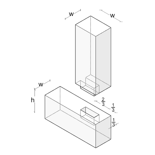 The tenon is shouldered on three sides, creating three shoulders that enable precise positioning and increased contact area. The corresponding mortise is cut exactly to match the tenon dimensions. The connection typically occurs as a plug-in joint in L-form between two perpendicular timber pieces.